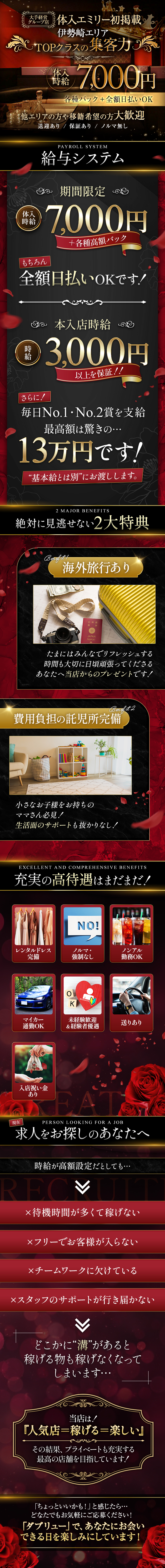 他にも、レンタルドレス完備、一週間ごとのシフト提出など、各種待遇を用意しております!
