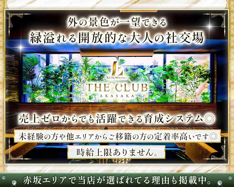 『THECLUBAKASAKA』はカジュアル感もありつつ、全面がガラス張りのデザイナーズ空間になっているそう。赤坂駅からは徒歩3分、赤坂見附駅からは徒歩1分と通勤もしやすいのがうれしいところ。女の子の頑張りに合わせ、時給制もしくは売上制とお給料のシステム提案をしてくれるのだとか。上下関係も一切なく、キャストが安心できる店づくりを意識されているなんてうれしいポイントですよね♪ハイクラスな客層としっかり稼げるシステムがある同店。気になる方はぜひお問い合わせしてみてくださいね◎