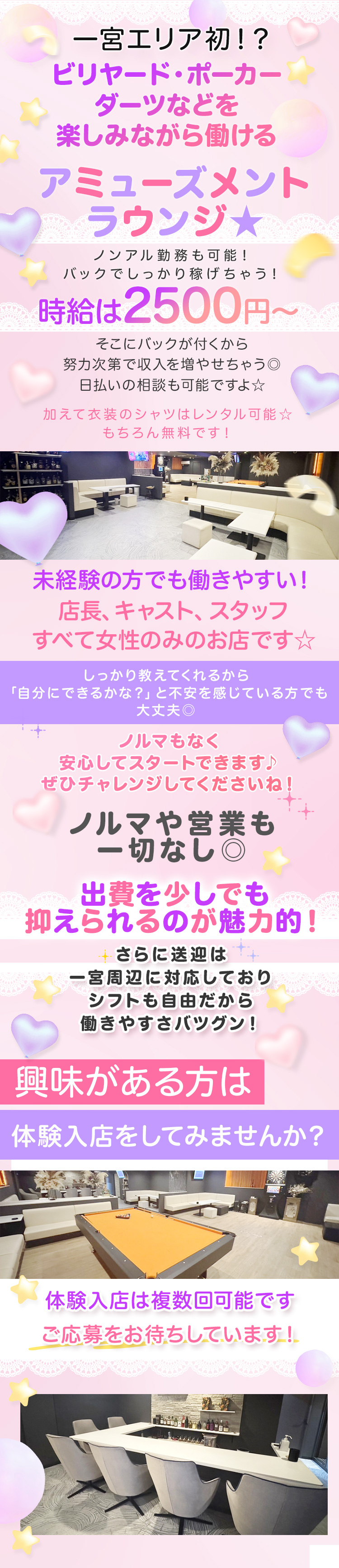 お店の雰囲気やビリヤードなどアミューズメント要素も実際に見て、働くイメージを膨らませてください☆ -