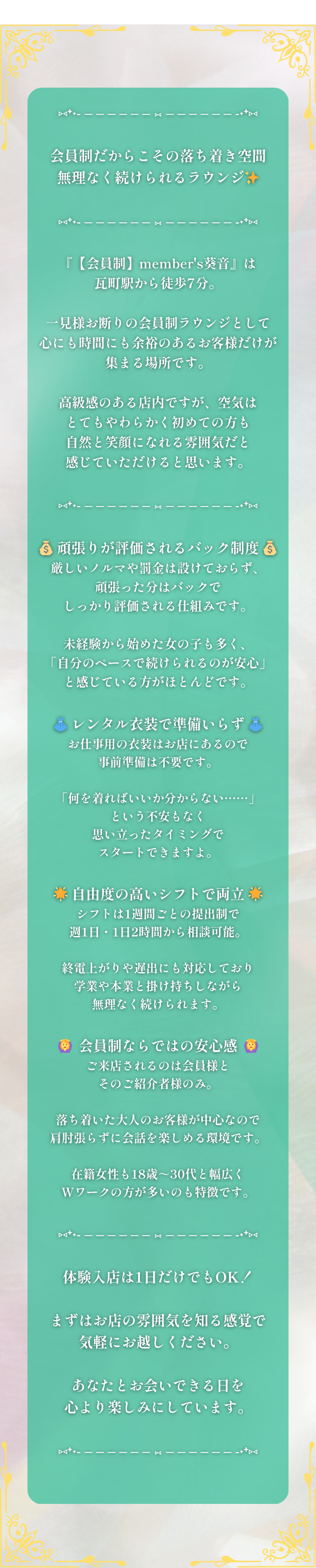 - 会員制だからお客様層が落ち着いていて安心!未経験でも会話を楽しみながら自分のペースで働ける